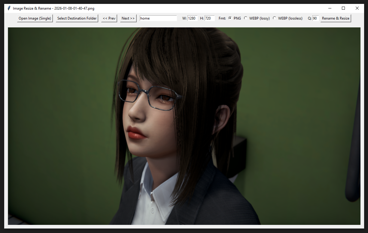 A lightweight utility tool designed for Visual Novel developers. Easily convert 4K renders to WebP, resize, and apply sequential renaming directly into your game folder.